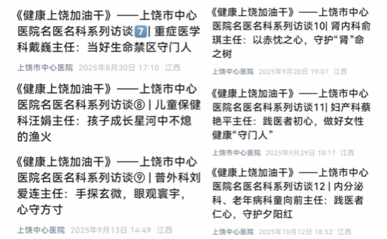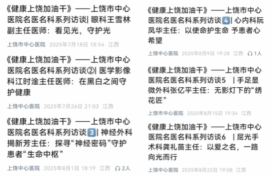 根据徐建军院长关于“加强医院品牌建设,提升医疗服务影响力,展现名医名科实力”的工作部署,医院宣传组特别策划并推出了《健康上饶加油干》名医名科系列访谈栏目。该栏目每周在医院微信公众号上更新一期,截至2025年12月30日,已累计发布22期访谈报道。
