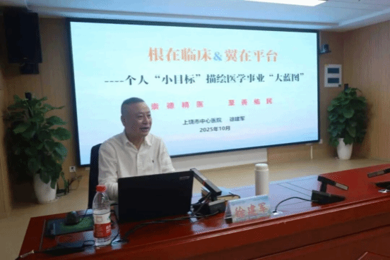 徐建军以《根在临床,翼在平台,个人“小目标”描绘医学事业“大蓝图”》 为题作主题授课,精准点明了临床工作是医学事业的根基,医院平台 是个人成长的支撑,清晰阐释了如何将个人事业发展与医院愿景深度 契合,让学员们深受启发。