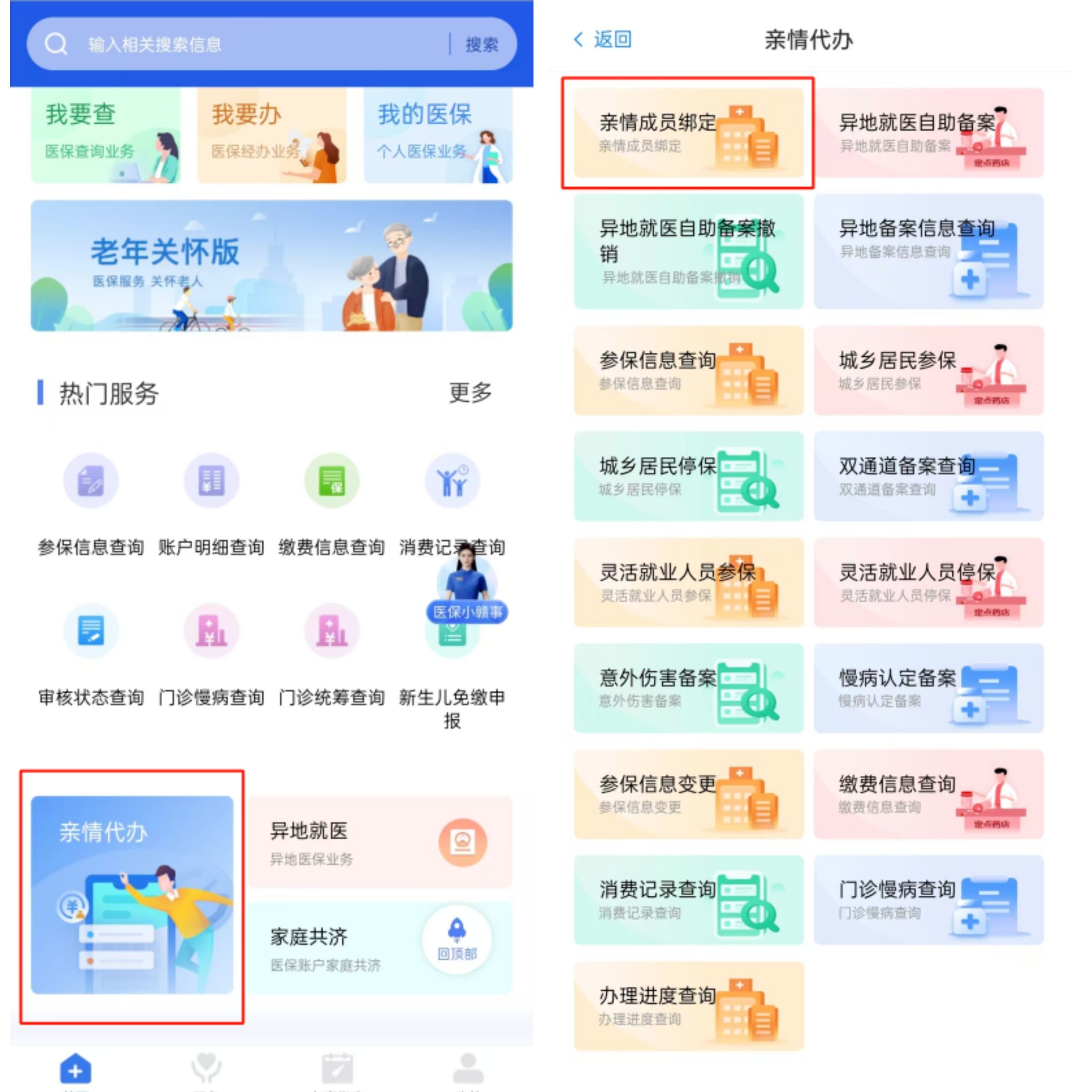 2. 在APP首页找到“亲情代办”栏目,点击进入,再点击“亲情成员绑定”。