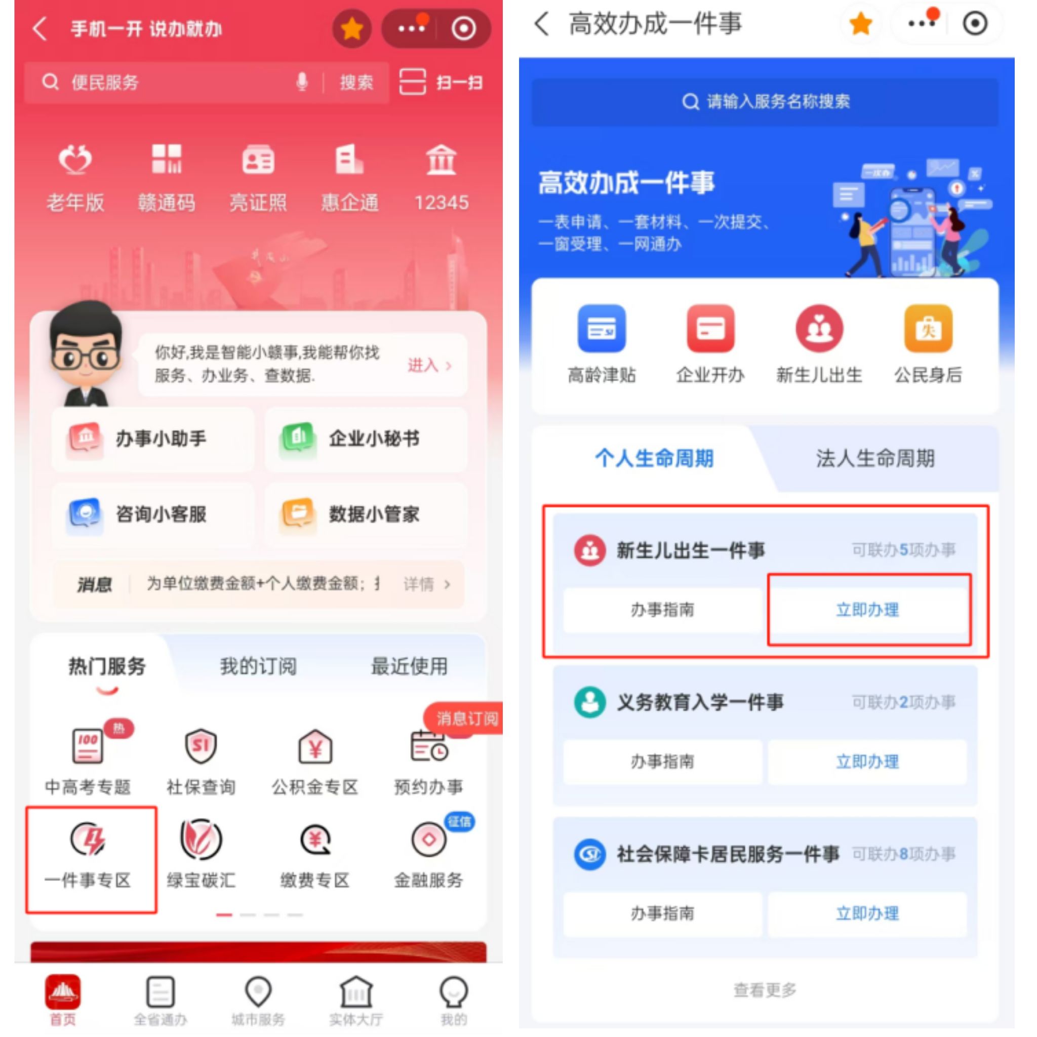 2. 在赣服通首页找“一件事专区”点击进入,选择“新生儿出生一件事”,点击“立即办理”。