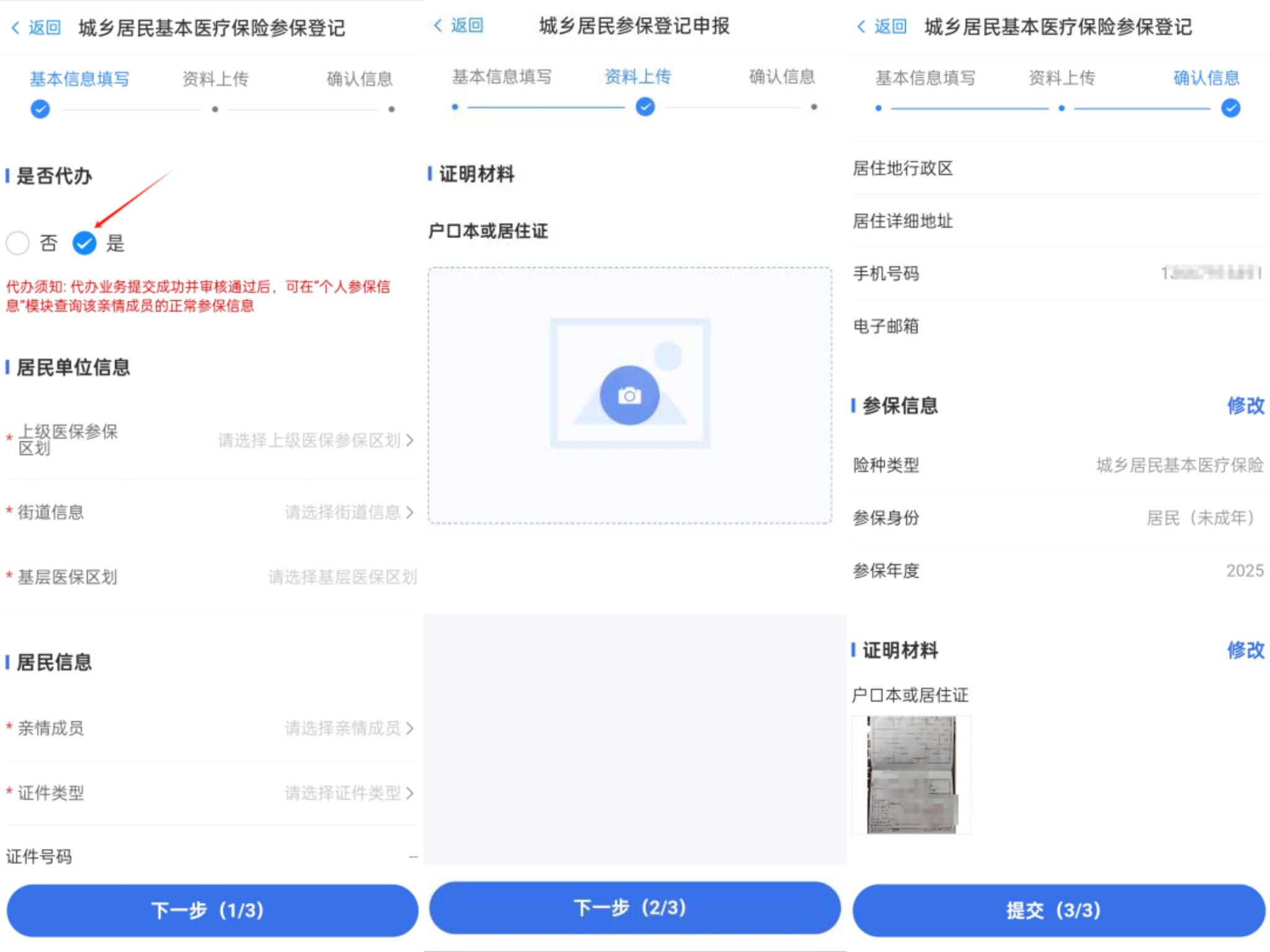 4. 成功绑定情亲成员后,点击“返回”按钮回到上一页,点击进入“城乡居民参保”,是否代办选择“是”,并按要求输入相关信息,点击“下一步”,上传户口本或居住证照片,点击“下一步”,信息确认无误后点击“提交”即可。