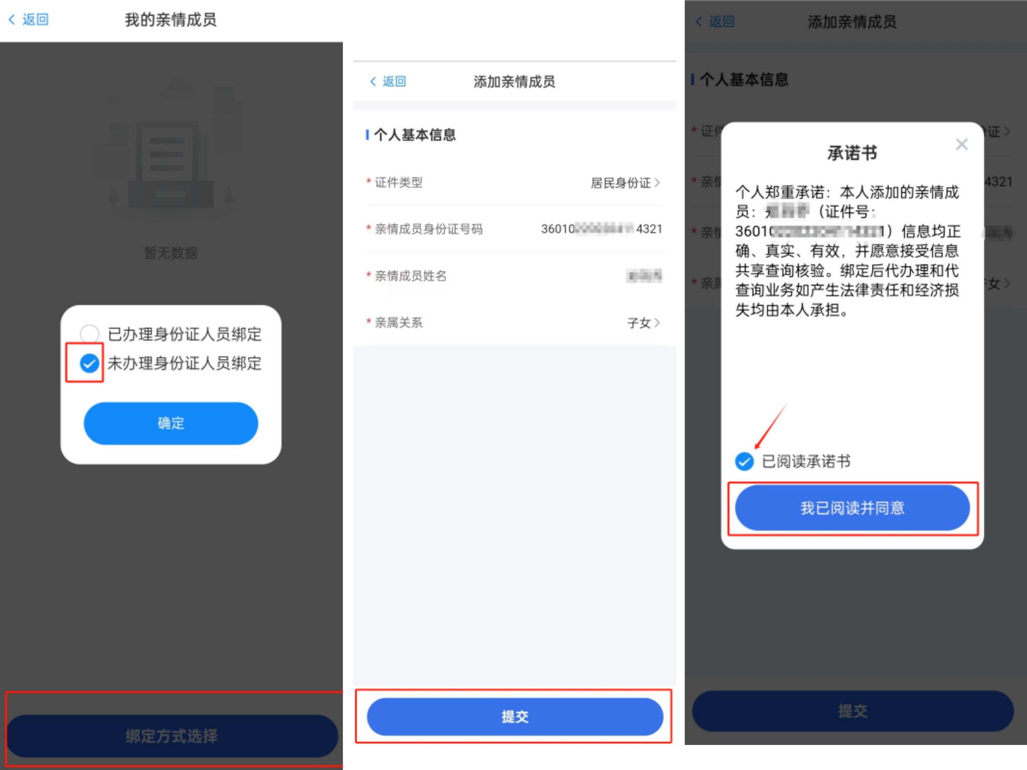 3. 点击“绑定方式选择”按钮,选择“未办理身份证人员绑定”,点击“确定”,输入新生儿的相关身份信息后,点击“提交”,选择“已阅读承诺书”点击“我已阅读并同意”。